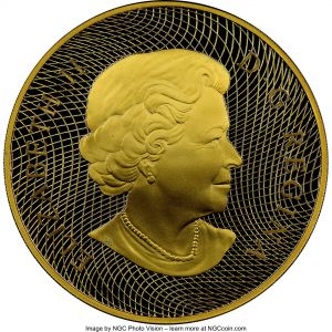 This specimen was lot 33463 in Heritage sale 3082 (New York, January 2020), where it sold for $1,920. The catalog description[1] noted, "Canada: Elizabeth II gold Proof "The 1870 Shinplaster - Vignette of Britannia" 300 Dollars 2005 PR70 Ultra Cameo NGC, Royal Canadian mint."