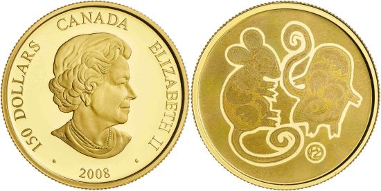 This specimen was lot 3217 in Aureo y Calicó sale 422 (Barcelona, December 2023), where it sold for 450 € (about US$583 including buyer's fees). The catalog description[1] noted, "Canadá. 2008. Isabel II. 150 dólares. Año de la Rata. Acuñación de 582 ejemplares. En estuche oficial con certificado [year of the rat, 582 minted, in official box with certificate]. AU 0,750. Proof." This denomination was first used in 1990 for a half ounce platinum coin (KM 176). This series of Chinese zodiac coins with hologram reverses commenced with the Year of the Dragon in 2000 (KM 388) and ended with the Year of the Rabbit in 2011 (KM 1053). As a whole, they did not sell well, perhaps because Asian buyers prefer 0.999 fine gold.