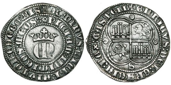 Cayón states that this coin had a face value of three maravedis at the time of issue. It was struck at Burgos, Cordoba, Coruña, Cuenca, Seville (shown here) and Toledo. It was the largest silver coin of the reign.