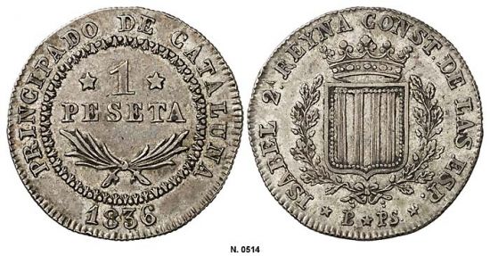 "1836. Barcelona. PS. 1 peseta. Rara. EBC. (One peseta of 1836, Barcelona mint, rare thus, extremely fine.)"
