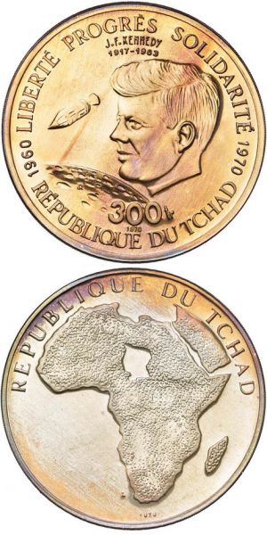 "TCHAD, République (1960-), série de 5 monnaies frappées en 1970 pour commémorer le 10eanniversaire de l'Indépendance: 300 francs, J.F. Kennedy; 200 francs, M. Luther King, Nasser et de Gaulle; 100 francs, R. Kennedy. K.M. 1, 4-7. Dans les pochettes en papier originales de la Monnaie de Belgique. Patines inégales. Fleur de Coin. (republic of Chad, series of five coins struck in 1970 to commemorate the tenth anniversary of independence, including 300 francs, 200 francs (3 pieces) and 100 francs. Included are the original paper envelopes of the Belgian mint. Uneven toning, Uncirculated.)"