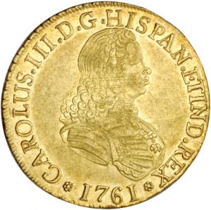 This specimen was lot 1339 in the Eliasberg sale, where it sold for $3910. It was one of a series struck 1760-63 in Chile during the reign of Charles III. It bears Charles' name but displays the bust of Ferdinand VI. The mintage is not recorded but 32,000 pieces are noted for 1762. It is not until the appearance of the standard bust type (KM 27) in 1772 that eight escudos become remotely affordable. The catalog description[1] noted, "1761 J 8 escudos. Santiago mint. AU-50 (NGC). Bust of Fernando VI to right, CAROLUS III in legends around, date below/arms, legends around. Lustrous yellow gold, subtle adjustment mark below temple, good eye appeal for the grade. A scarce transitional type. This date is called 'rara' (rare) in Calico."