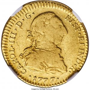 This specimen was lot 34491 in Heritage sale 3094 (Chicago, August 2021), where it sold for $3,613.20. The catalog description[1] noted, "Chile: Charles III gold 2 Escudos 1777/6 So-DA VF25 NGC, Santiago mint, Truly a unique offering, entirely missing from Calico as well as the major collections of Norweb and Eliasberg. Despite a heavily worn portrait of Charles III, the legends and bold overdate remain well preserved while the reverse is essentially unimpacted by circulation, retaining heavy originality. An opportunity unlikely to be seen again for some time." All the two escudos of Charles III are rare. This is the first one we have posted. The SCWC lists 1773-74, 1782-83 and 1786-89.