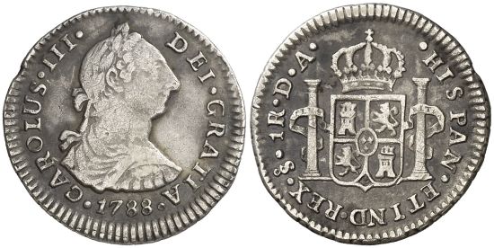 The first specimen was lot 1678 in Aureo y Calicó sale 423 (Barcelona, December 2023), where it sold for 150 € (about US$194 including buyer's fees). The catalog description[1] noted, "1788/7. Carlos III. Santiago. DA. 1 real. Graded NGC as F12, no. 2892732-013. Very Fine example. Ex Aureo y Calicó 12/17/2008, no. 422. Val and Mexía Collection. Rare with overdate, especially in this condition. BC+/MBC- [fine to very fine]." The second specimen was lot 1679 in Aureo y Calicó sale 423 (Barcelona, December 2023), where it sold for 150 € (about US$194 including buyer's fees). The catalog description[1] noted, "1788. Carlos III. Santiago. DA. 1 real. (AC. 526). Small coinage defect on edge. Ex Aureo y Calicó 01/26/2011, no. 843. Val and Mexía Collection. Rare, especially in this condition. MBC-/MBC [about very fne]." This type was struck at Santiago 1773-89 and is very scarce. The later dates after the debasement of 1785 turn up occasionally.