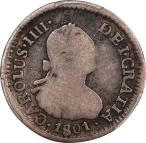 This specimen was lot 74142 in Stack's Bowers Collectors Choice sale (Costa Mesa, CA, October 2025), where it did not sell. The catalog description[1] noted, "CHILE. 1/2 Real, 1801-So AJ. Santiago Mint. Charles IV. PCGS Genuine--Bent, VG Details. From the Richard August Collection." This type was struck at Santiago 1792-1808 in limited numbers and, tho not common, is much less rare than preceding types. The SCWC notes a "broken J" variety wherein the assayer appears to read "AI" instead of "AJ".