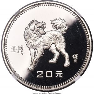 This specimen was lot 30612 in Heritage sale 3064 (Chicago, April 2018), where it sold for $1,320. The catalog description[1] noted, "People's Republic silver "Year of the Dog" Proof 20 Yuan 1982 PR69 Ultra Cameo NGC. Essentially as-made quality with intricately frosted raised surfaces that appear to float atop the deeply reflective fields." The Chinese government has, since the mid 1980's, produced a mind boggling array of bullion related collectibles. A complete set is thousands of types yet buyers clamor for more. This NCLT has the same module as the Year of the Cock (KM 40) issued the year before but is denominated 20 yuan instead of 30 yuan. The next year's issue, for the Year of the Pig (KM 73), was a ten yuan.