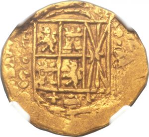 This specimen was lot 29575 in Heritage sale 3040 (Long Beach, April 2015), where it sold for $2,115. The catalog description[1] noted, "Ferdinand VI gold Cob 4 Escudos ND (1751-52) AU50 NGC, Santa Fe mint, Well preserved with little actual wear and attractive orange toning. Struck over a smallish flan as frequently seen so date is not apparent. The bold 4/8 denomination on the obverse and the style of the ribbons on the reverse allow to assign it to the 1751-1752 period per Restrepo's detailed study. A good representative of this very rare type, desirable despite the lack of a clear date." This type is listed for 1747-56 with all dates marked as rare. Milled coinage of gold commenced in 1756.