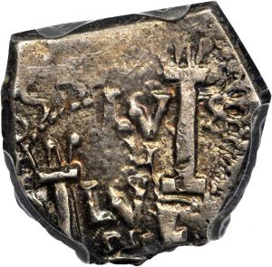 "COLOMBIA. 1653-R Real. Santa Fe de Nuevo Reino (Bogotá) mint. Philip IV (1621-1665). Restrepo M24.9. AU-50 (PCGS). Cataloged by Nesmith as 1655 and our consignor as 1653; we could make a case for either but given the presence of an R from the mintmark left of the reverse shield, we will err on the side of 1653. Ideally centered on the obverse with a fine strike, showing four digits of the date at upper left. The reverse is also well centered, not as well struck but showing lovely bright blue toning in the lustrous recesses. A really exemplary type coin. From the Eldorado Collection of Colombian and Ecuadorian Coins. From a hoard discovered by Clyde Hubbard in Medellín in the 1950s and subsequently published by Robert I. Nesmith. Plated in Nesmith's "A Hoard of the First Silver Coins of Nuevo Reino de Granada (Colombia)," 1958, coin #10i, illustrated on plate XXXI and in a line drawing on p. 529."