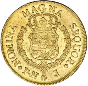 "1771 J 8 escudos. Popayán mint. AU-55 (NGC). Types as above. Large draped and armored bust of Fernando VI to right, CAROLS III in legends around, date below/crowned arms, legends around. Lustrous even yellow gold, some lustre remaining in the recesses, scattered contact and handling marks, and a short cut well hidden in the reverse crown. A scarce and popular issue, the last date of the type. This date represents the last use of the ancient Fernando VI bust, as a standard bust of Carlos III was promulgated in 1772. From the John H. Clapp Collection; Clapp estate to Louis E. Eliasberg, Sr., 1942."