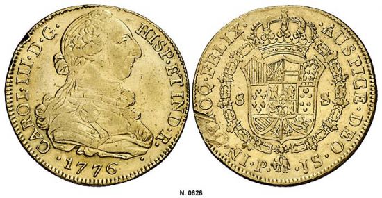 "Carlos III (1759-1788). 1776. Popayán. JS. 8 escudos. Golpecitos y hojitas. Parte de brillo original. Muy rara. (MBC+). (Eight escudos of 1776, Popayán mint. Nicks and scratches, some original luster, very rare, very fine.)"