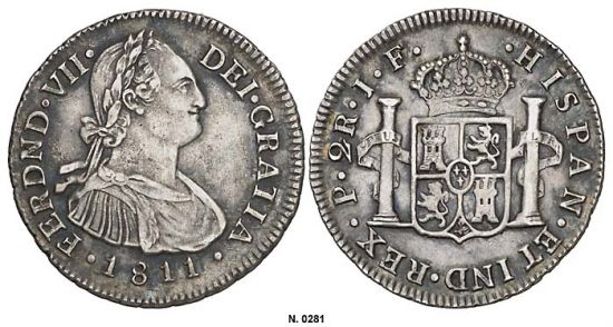 "Fernando VII (1808-1833). 1811. Popayán. JF. 2 reales. Atractiva. Rara y más así. EBC-. (Ferdinand VII, 1808-33, two reales of 1811, Popayán mint. Attractive, rare thus, about extremely fine)."