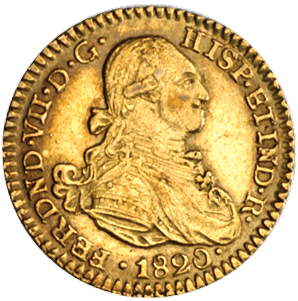 This specimen was lot 1554 in the Eliasberg sale, where it sold for $287.50. The catalog description[1] noted, "1820 JF 1 escudo. Bogotá mint. AU-58 (NGC). Types as above. Pale medium gold. From the John H. Clapp Collection; Clapp estate to Louis E. Eliasberg, Sr., 1942." This type was struck at Bogotá 1808-20 and at Popayán 1808-19 and is among the more available Spanish colonial gold coins.