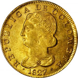 This specimen was lot 12118 in Stack's Bowers NYINC sale (New York, January 2018), where it sold for $5,760. The catalog description[1] noted, "COLOMBIA. 1827-FM 8 Escudos. Popayán mint. MS-62 (PCGS). A frosty delight, with choice light yellow gold color and no significant flaws. The top of the fasces is a little softly struck, but otherwise this piece has everything a collector could desire in a choice type coin. From the Eldorado Collection of Colombian and Ecuadorian Coins. From Heritage, August 1990." This type was struck at Popayán 1822-36 and at Bogotá 1822-38. It was superseded by the quasi-decimal sixteen pesos issued at both mints 1837-49. Both types are common enough that some attempt to collect complete date sets. This date is listed as common. Assayer FM is known for 1816-30.