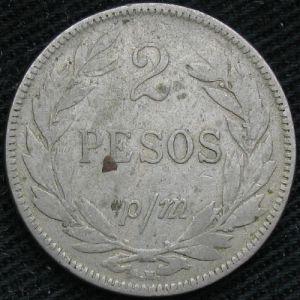 This copper-nickel two pesos "papel moneda" was struck for Colombia in 1907, 1910 and 1914. These coins were issued to retire paper money printed during the civil war of 1899-1903, hence the "p/m" marked on the reverse. The chaos of that civil war enabled the United States to engineer Panamanian independence. They later circulated equal to the copper-nickel two centavos of 1918-47 (KM 198). They are today very scarce in nice condition. The second specimen was lot 1721 in Sedwick Treasure Auction 27 (Winter Park, FL, May 2020), where it sold for $142.80. The catalog description[1] noted, "Colombia, copper-nickel papel moneda 2 pesos, 1910AM, NGC MS 64. Lustrous with faint multicolored toning, nicely struck. NGC #4770572-015."