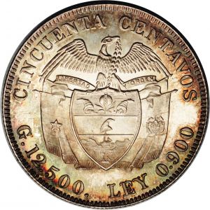 This fifty centavos was struck in Bogotá, Colombia, of a type issued 1912-33. This type, with the portrait of hero Simon Bolivar, superseded the liberty head type last struck in 1908. The date is common but this specimen, from the Whittier sale, is a very rare proof. To the delight and despair of collectors, the half dollars of Colombia come in a profusion of dates, styles, varieties and errors and form a collecting specialty all their own.