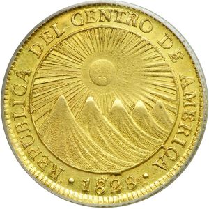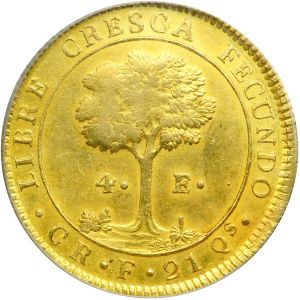"Costa Rica. 4 Escudos, 1828-CR-F. Radiant sun face over row of volcanos. Reverse: Tree on foliate ground, value on either side. Nicer than the grade indicates. Rare. PCGS graded AU-58."