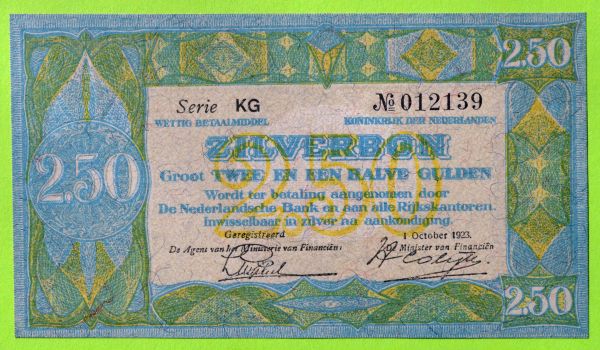 Dutch currency was issued in denominations of one gulden to one thousand gulden. The series began in 1814 with a twenty-five gulden (Mevius-72-1), forty gulden (Mevius-90-1), sixty gulden (Mevius-105-1), one hundred gulden (Mevius-110-1), two hundred gulden (Mevius-130-1), three hundred gulden (Mevius-135-1), five hundred gulden (Mevius-140-1) and one thousand gulden (Mevius-147-1) and continued until the introduction of the euro in 2002. Issues prior to the 1930's are scarce to rare. The 1923 one gulden (Mevius 12-6) shown here is dated 1-10-23 and signed Luysterburg/Colijn. It is 71 x 129 mm. Issued 1918-27, it is fairly scarce.
