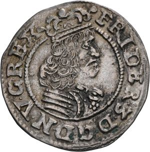 This specimen was lot 10252 in Stack's Bowers Collectors Choice Online Auction (Costa Mesa, CA, February 2025), where it sold for €264 (about US$275). The catalog description[1] noted, "DENMARK. 1/16 Speciedaler (3 Skilling Lybsk), 1667-IW. Gluckstadt Mint. Frederik III. NGC AU-58. From the L. E. Bruun Collection." Frederick III was king of Denmark and duke of Schleswig-Holstein, where this coin was struck in 1667-70. We don't see the initials "IW" reported in the auction description.