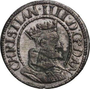 This specimen was lot 10187 in Stack's Bowers Collectors Choice Online Auction (Costa Mesa, CA, February 2025), where it sold for €336 (about US$350). The catalog description[1] noted, "DENMARK. Søsling, ND. (1607-1609). Copenhagen Mint. Christian IV. NGC MS-62. Enchanting coin with bright luster. From the L. E. Bruun Collection." This undated type is basically copper with a tincture of silver. It was probably worth 1/128 speciedaler. Numerous varieties exist (KM 40.1 thru KM 40.4). The next søsling of 1624 was pure copper. Christian IV (r. 1588-1648), king of Denmark and duke of Schleswig-Holstein, had a long but only moderately successful reign. His war with Sweden and his intervention in the Thirty Years War were costly and brought little gain.