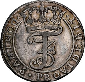 This specimen was lot 10258 in Stack's Bowers Collectors Choice Online Auction (Costa Mesa, CA, February 2025), where it sold for €1,200 (about US$1,251). The catalog description[2] noted, "DENMARK. Krone, 1669. Frederik III. NGC EF-45. An extraordinary example of this rare "Mysteriekrone". Mysteriekroner (literally 'Mystery Crowns') are a larger group of contemporary, foreign professional imitations/counterfeits of crowns from the Danish-Norwegian mints in Copenhagen, Christiania, and Glückstadt 1653-1679. The exact place or places of production are not known, but everything points to northern Germany as the place of production, possibly in the non-royal parts of Schleswig-Holstein. From the L. E. Bruun Collection." We are cataloguing this as if it were genuine, one of a type struck 1667 and 1669. Kroner for 1669 include KM 274/Dav-3581, KM 276/Dav-3582, KM 285/Dav-3581B (no initials, shown here) and KM 306/Dav-3584. None are priced above Very Fine. Most Danish crowns of the seventeenth century are scarce to extremely rare, likely a reflection of the poverty of the king's government.