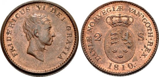 This specimen was lot 155 in Classical Numismatic Group's sale of the Lissner Collection (Chicago, August 2014), where it sold for $72.60. The catalog description[1] noted, "DENMARK. Frederik VI. 1808-1839. CU 2 Skilling. København (Copenhagen) mint. Dated 1810. In NGC encapsulation graded MS 64 BN. Moderate toning with almost full red showing through. Superb quality for the type. Very rare to see so much red luster on this two year type." Danish currency endured several "reforms" in the nineteenth century. Until 1813, 1 ducat = 2 speciedaler = 12 mark = 192 skilling Danske. After the reform of 1813, 1 frederiks d'or = 5 speciedaler = 10 rigsbankdaler = 960 rigsbankskilling. In 1854, the speciedaler was dropped but the remaining denominations were unchanged. In 1874, all the old denominations were terminated in favor of 1 krone = 100 øre, which system is still in use, tho the krone is no longer silver. This type is listed for 1809-10. This specimen sold for less than the catalog value, one of the few lots in the sale to do so.