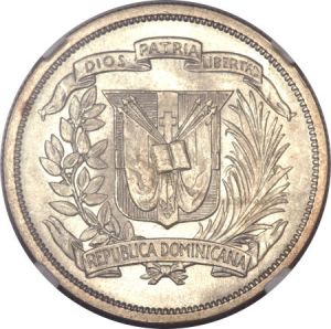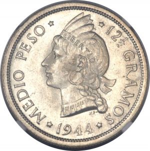 This specimen was lot 24453 in Heritage sale 3026 (Long Beach, October 2013), where it sold for $1,292.50. The catalog description[1] noted, "Republic 1/2 Peso 1944, MS64 NGC, a choice example of this key low mintage date with full icy white mint brilliance and minimal contact marks on the Indian bust side. Rarely seen in this superior quality." The specimen shown was struck for the Dominican Republic during the early years of the regime of Rafael Trujillo, among the more brutal of Latin America's long roll of bloodthirsty dictators. Soon after his assassination in 1961, the capital, which he had renamed Ciudad Trujillo, reverted to its former name, Santo Domingo. The type was struck 1937-61; this date is scarce in uncirculated but otherwise common.