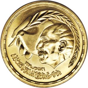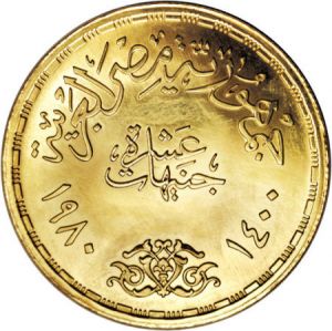 This specimen was lot 50693 in Heritage sale 440 (Long Beach, May 2007), where it sold for $977.50. The catalog description[1] noted, "Republic gold 10 Pounds 1980, choice BU, Egypt-Israel Peace Treaty." This is the first issue from Egypt of this denomination. There was a concurrent issue of gold five pounds (KM 517), gold pound (KM 509), silver pound (KM 508) and copper-nickel 10 piastres (KM 504).