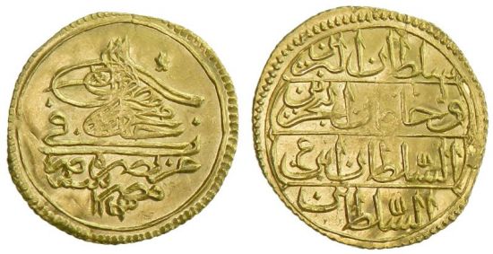 This coin is a gold zeri mahbub, struck during the reign of Mahmud I. The date AH 1143 which translates to 1730 AD. During this period, coins minted in Egypt were very similar in appearance to those struck in other parts of the Ottoman Empire. The obverse features the royal cypher of the sultan. Uslu[2] classifies this issue as common. No issuing year is explicitly stated, though the coin is marked with an initial ('ayn) corresponding to the number 12. The first specimen shown was lot 320 in Steve Album sale 16 (Santa Rosa, CA, May 2013), where it sold for US$153.40. The catalog description reads[1]: "EGYPT: Mahmud I, 1730-1754, AV zeri mahbub, Misr, AH1143, initial #12, touch of weakness, About Unc." The second specimen was lot 342 in Stephen Album sale 47 (Santa Rosa, CA, September 2023), where it sold for $356. The catalog description[3] noted, "EGYPT: Mahmud I, 1730-1754, AV zeri mahbub, Misr, AH1143, with initial #12, lustrous Unc."