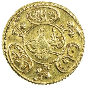 This specimen was lot 646 in Stephen Album sale 37 (Santa Rosa, CA, June 2020), where it sold for $190.40. The catalog description[1] noted, "EGYPT: Mahmud II, 1808-1839, AV ½ zeri mahbub, Misr, AH1223 year 22, much original luster, Unc, R, ex Gamal Amer Collection." The coin shown is a gold half mahbub from the reign of Sultan Mahmud II. It was struck at the Cairo Mint. The denomination 'mahbub' was used prior to the coinage reform of 1834, after which gold coins were denominated in qirsh. The obverse bears the toughra, or signature, of the sultan, with an ornate boundary of script and flowers. In this variety, no denominational value appears under the toughra. The reverse carries the ascension date and the text minted in Misr (Misr is Arabic for Egypt). The date is written as AH 1223 year 22, which translates to about 1828 AD. This type was struck years 21-28.