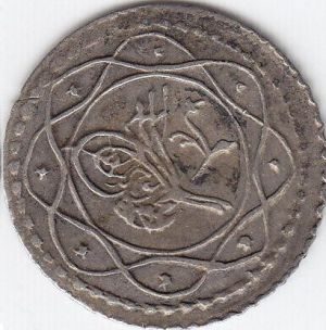 The coin shown is a billon ten para from the reign of Sultan Mahmud II. It was struck at the Cairo Mint. The obverse bears the toughra, or signature, of the sultan enclosed by an ornate border. The date is written on the reverse as AH 1223 year 23, which translates to about 1829 AD.