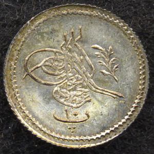 The coin shown is a 10 para, composition silver, from the reign of Sultan Abdul Mejid. It was struck at the Cairo Mint. The obverse bears the toughra, or signature, of the sultan, with the denomination written below (abbreviated as the letter P for para) with the number 10 above. A crude floral design sits right of the toughra. The reverse carries the ascension date and the text minted in Misr (Misr is Arabic for Egypt). The date is written as AH 1255 year 2, which translates to about 1840 AD. Uslu[1] lists this issue as rare.