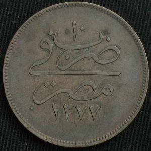 The coin shown is a copper twenty para, from the reign of Sultan Abdul Aziz. It was struck at the Paris Mint. The obverse bears the toughra, or signature, of the sultan, with the denomination written below (abbreviated as the letter P for para) with the number 20. The reverse carries the ascension date and the text minted in Misr (Misr is Arabic for Egypt). The date is written as AH 1277 year 10, which translates to about 1869 AD. Uslu[1] lists this issue as scarce.