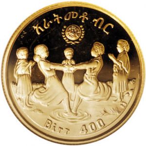 The coin shown is a 400 birr gold coin, dated 1972 (Ethiopian Era). On the obverse is a portrait of children playing. The reverse promotes the Year of the Child.
