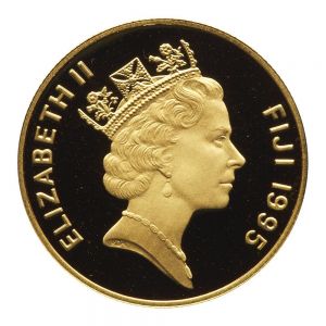 This specimen was lot 1060 in Goldberg sale 116 (Los Angeles, June 2020), where it sold for $630. The catalog description[1] noted, "Fiji. 100 Dollars, 1995. Silver Jub[il]ee of independence. Choice Brilliant Proof." Sterling coinage was issued for the islands starting in 1934. Decimal conversion occurred in 1967-69, the same time as Britain. Fiji left the British Commonwealth in 1987 but rejoined in 1997.