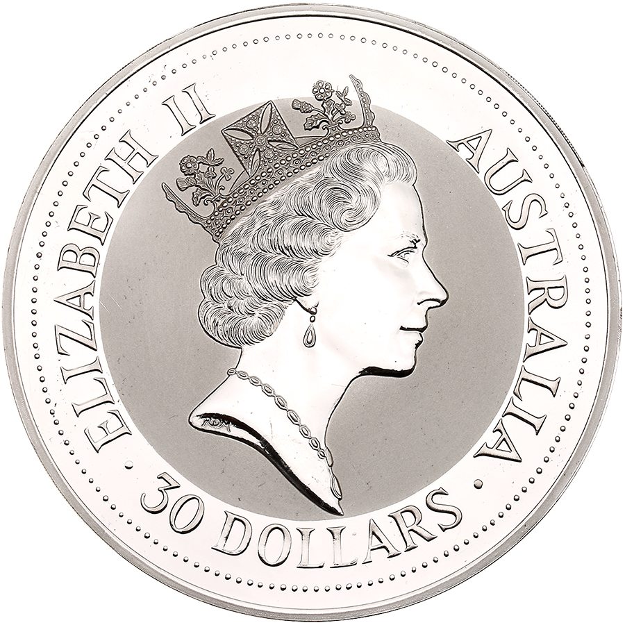 This specimen was lot 2556 in Goldberg sale 91 (Los Angeles, June 2016), where it sold for $763.75. The catalog description[1] noted, "Australia. 30 Dollar Silver Kookaburras, 1992 Gem Proof. KM-181. The first of this largest format Silver Kookaburras, containing 1 kilogram of .999 pure silver. 32.15 total ounces. Only 1,000 pieces struck in proof. This coin together with the following lot originally belong to Max Baer Jr., the famous American actor played Jethro Bodine on the The Beverly Hillbillies. This lot also includes a signed photo with Max Baer Jr. holding two Silver Kookaburras (this and the following lot). Lot of 2 items. This coin is in Gem Proof condition. Ex: Max Baer Jr. Collection."