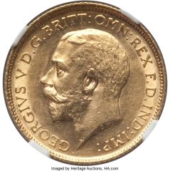 This specimen was lot 32462 in Heritage sale 3064 (Chicago, April 2018), where it sold for $384. The catalog description[1] noted, "George V gold 1/2 Sovereign 1914-S MS63 NGC, Sydney mint, KM 28. A captivating example with dark contouring of George's bust in even the lowest light."