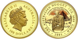 "Australien, Elizabeth II. 1952-. 100 Dollars 2001. Auf die 150-Jahrfeier des ersten Goldrausches. Im Originaletui. 31.14 g. KM 906. Fr-B20. Polierte Platte. FDC. (commonwealth of Australia, Elizabeth II, since 1952, one hundred dollars of 2001, 150th anniversary of the first gold rush in Australia. Original box, Choice Proof.)"