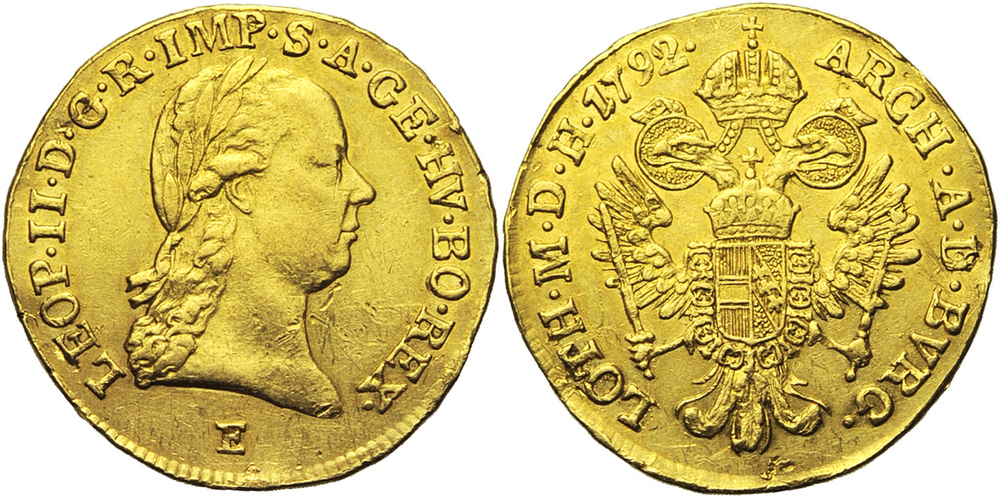 "SAINT EMPIRE, Léopold II (1790-1792), AV ducat, 1792#E, Karlsburg. D/ T. l. à d. R/ Aigle impériale couronnée avec l'écu d'Autriche sur la poitrine. Jaeckel 82; Her. 10; Fr. 207. 3,41g. Légères traces de monture Très Beau. (Holy Roman Empire, Leopold II (1790-92), gold ducat of 1792, Karlsburg mint. Obverse: laureate bust to right; reverse: crowned imperial eagle with the arms of Austria on its breast. Slight trace of mounting, very fine.)"