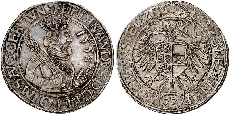 "RÖMISCH-DEUTSCHES REICH, Ferdinand I. 1522-1558-1564. Reichsguldiner (72 Kreuzer) 1558, Klagenfurt. Dav-8023; Voglh. 51 II. Selten, besonders in dieser Erhaltung. Sehr attraktives Exemplar mit hübscher Patina, fast vorzüglich. (Holy Roman Empire, Ferdinand I, 1522-64, guldiner of 1558, Klagenfurt mint. Scarce in this quality, very attractive example with beautiful patina, about extremely fine.)"
