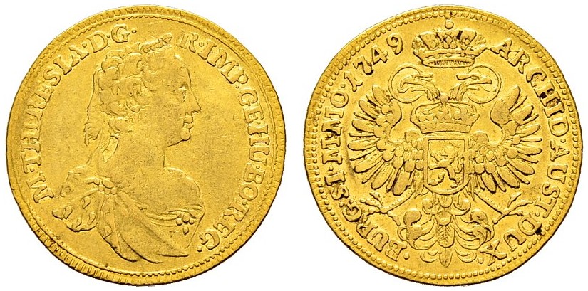 "HOLY ROMAN EMPIRE - AUSTRIA, Maria Theresia, 1740-1780 Dukat 1749. Prag 3.43 g. Dietiker 1084. Fr. Sehr selten. Gutes sehr schön. Min. gewellt. (Holy Roman Empire, Maria Theresia, 1740-80, ducat of 1749, Prague mint. Very rare, good very fine, slightly bent.)"