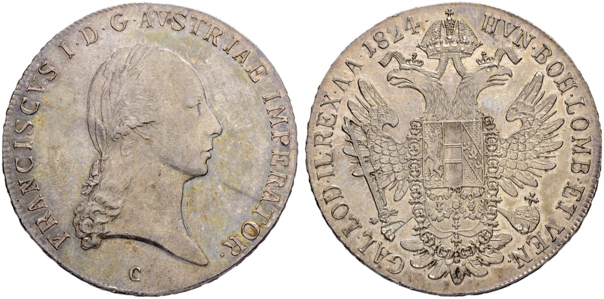 "Heiliges Romisch Reich, Franz II. (I.), 1792-1835. Taler 1824 C, Prag. 28.04 g. Herinek 322. Dav-7. Fast FDC. (Holy Roman Empire, Austria, Francis I, 1792-1835, thaler of 1824, Prague mint. About uncirculated.)"