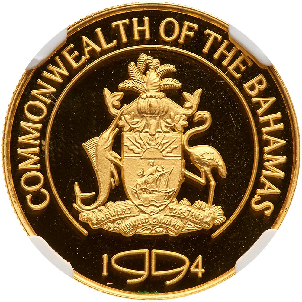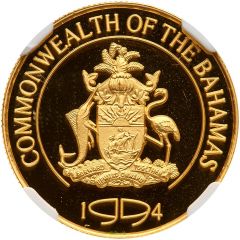This specimen was lot 2300 in Goldberg sale 103 (Los Angeles, February 2018), where it sold for $352.50. The catalog description[1] noted, "Bahamas. 10 Dollars, 1994. Fr-65; KM-156. Weight 0.2500 ounce. Golf - Hole in One. Only 2500 minted of this one year type. Tied for finest graded. NGC graded Proof 69."