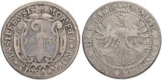"SWITZERLAND, Basel, Stadt und Kanton Basel, Halbtaler 1640. 13.53 g. Winterstein 149. D.T. 1347. HMZ 2-80j. Fast sehr schön. (city and canton of Basel, half thaler of 1640. About very fine.)"