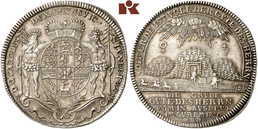 "BRAUNSCHWEIG-WOLFENBÜTTEL, FÜRSTENTUM Karl I. 1735-1780. Reichstaler 1752, Zellerfeld. Ausbeute der Grube Güte des Herrn. Dav-2164; Müseler 10.3/56; Welter 2724. Sehr attraktives Exemplar mit hübscher Patina, vorzüglich. (principality of Brunswick-Wolfenbuttel, Charles I, 1735-80, thaler of 1752, Zellerfeld mint, for the "Goodness of the Lord" mine. Attractive, extremely fine with nice patina.)"