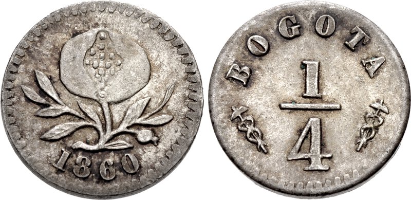 This specimen was lot 1476 in Classical Numismatic Group's sale of the Lissner Collection (Chicago, July 2014), where it sold for $__. The catalog description[1] noted, "COLOMBIA, Confederación Granadina. 1858-1863. AR 1/4 Real (11mm, 0.86 g, 6h). Bogotá mint. Dated 1860. Caducei flanking fraction. KM 131. In NGC encapsulation graded MS 65. Lovely moderate toning. The only coin of this date graded. Extremely rare this choice. Purchased from M. Geiger, November 1980."