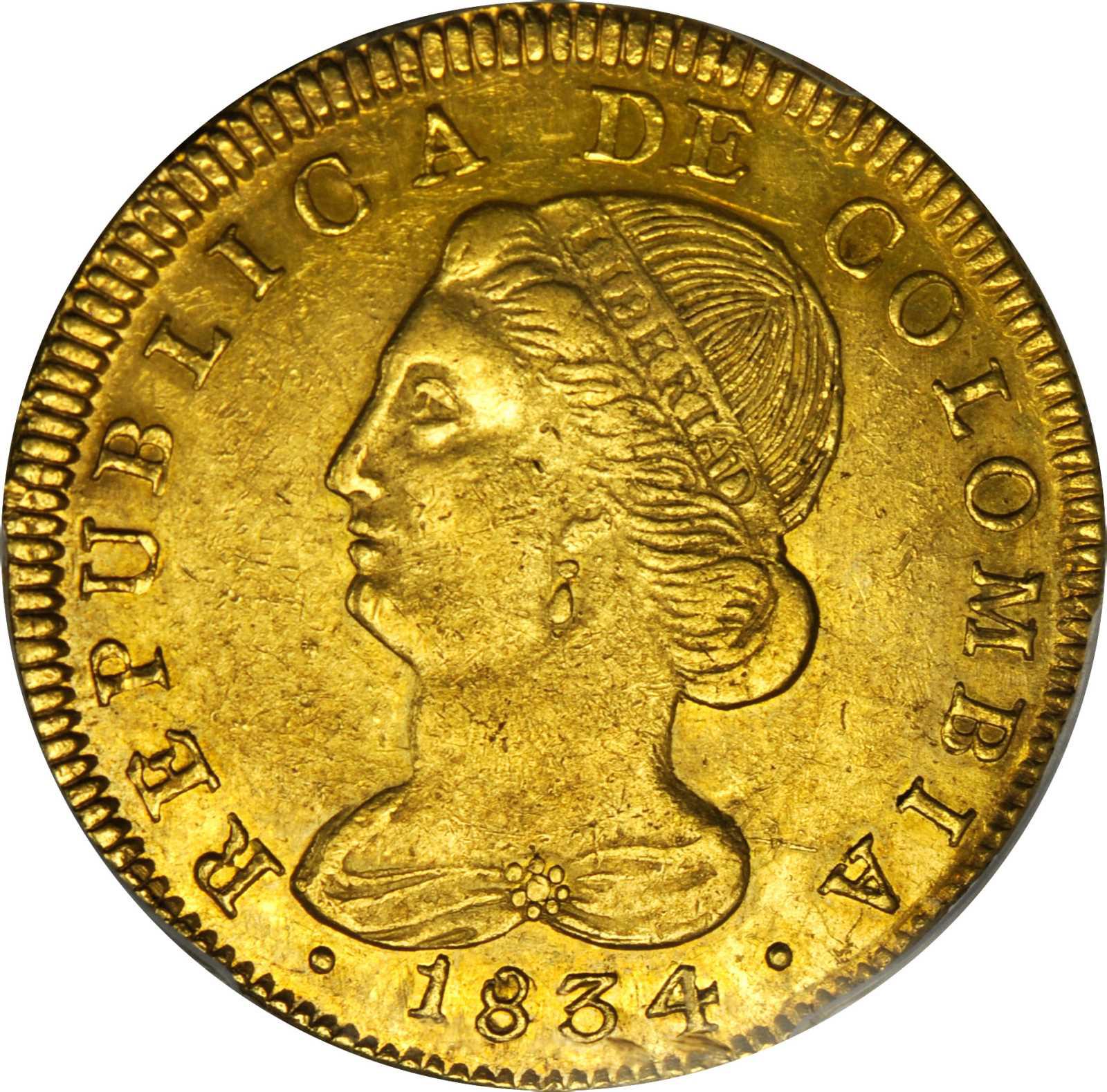 This specimen was lot 12138 in Stack's Bowers NYINC sale (New York, January 2018), where it sold for $1,170. The catalog description[1] noted, "COLOMBIA. 1834-UR 8 Escudos. Popayán mint. Restrepo M166.39. AU-55 (PCGS). Frosty and pleasing, with light yellow gold surfaces and a bold central strike. The obverse is aligned to the lower right, the reverse to the upper right. A few trivial reverse laminations are seen, but both sides are free of notable post-striking defects. From the Eldorado Collection of Colombian and Ecuadorian Coins. From Stack's, March 1968."