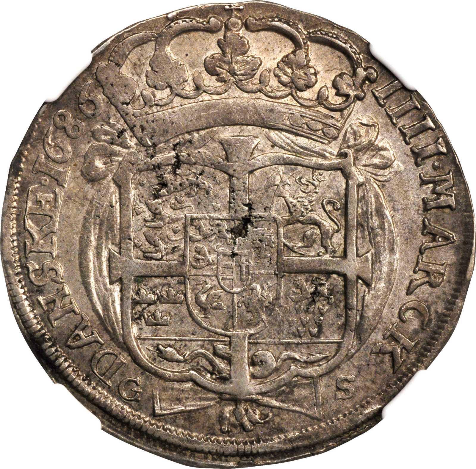 This specimen was lot 22314 in Stack's Bowers ANA sale (Philadelphia, August 2018), where it sold for $432. The catalog description[1] noted, "DENMARK. Krone (4 Mark), 1686-GS. Christian V (1670-99). NGC AU-55. Dav-3639; KM-386.1. Draped shield. Gray toned with evident luster remaining in the fields. Several planchet inclusion appear over both sides."