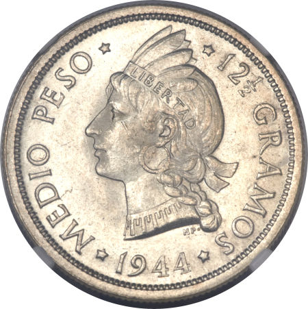 This specimen was lot 24453 in Heritage sale 3026 (Long Beach, October 2013), where it sold for $1,292.50. The catalog description[1] noted, "Republic 1/2 Peso 1944, KM 21, MS64 NGC, a choice example of this key low mintage date with full icy white mint brilliance and minimal contact marks on the Indian bust side. Rarely seen in this superior quality."