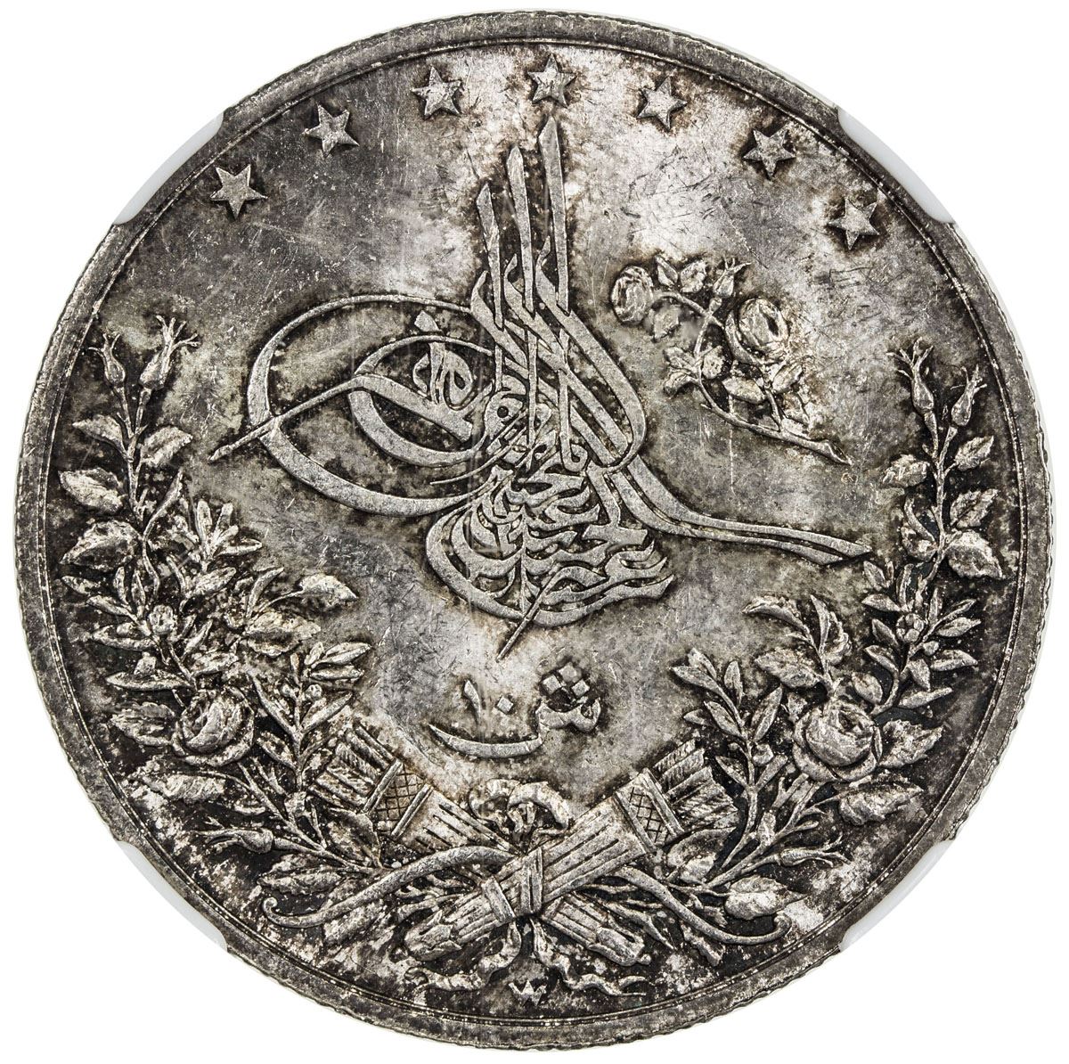 This specimen was lot 459 in Stephen Album sale 30 (Santa Rosa, CA, January 2018), where it sold for $305.50. The catalog description[1] noted, "EGYPT: Abdul Hamid II, 1876-1909, AR 10 qirsh, AH1293-W year 11, KM-295, NGC graded MS63."
