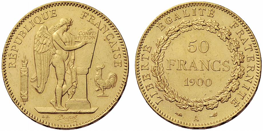 FRANKREICH Troisième Republique, 1871-1940. 50 Francs 1900, Paris. 16,11 g. Gad. 1113. Schl. 428. Fr. 591. Äußerst seltener Jahrgang. Nur 200 Exemplare geprägt. Vorzüglich.